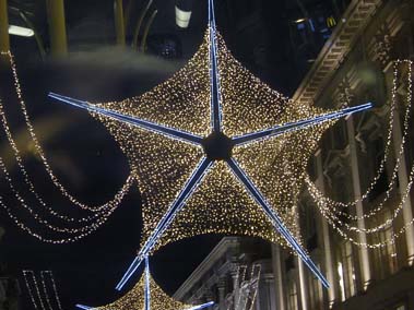 leuchten überall in der Stadt Sterne und Lichterketten.
