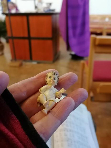In der Zeit im Advent trage ich immer ein kleines Gotteskind in meiner Hosentasche mit und lege es an besondere oder ganz alltägliche Orte und halte es in einem Foto fest, mit dem Titel: „Auf der Suche nach dem Gotteskind“. Manchmal treffe ich Leute, die in Dunkelheit und Trauer leben. Dann hole ich das Gotteskind aus der Tasche und halte es dem Menschen in meiner Hand hin. Die Augen beginnen zu leuchten und das Herz auch.