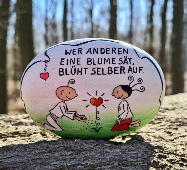 Dazu passt der bemalte Stein, den meine Firmpatin mir als Ostergruß schickte, darauf stand in bunten Buchstaben der Spruch : „Wer andern eine Blume sät, blüht selber auf.“